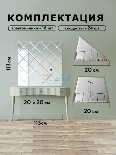 Зеркальное панно из зеркальной плитки 20 см с фацетом 10 мм (размер 113х113см) Внимание! Пожалуйста более подробно ознакомьтесь с комплектацией и составом панно при заказе в количестве 1 шт. Область применения: Зеркальная плитка преображает пространство. Даже самой маленькой и темной комнате она способна добавить глубины и света. При помощи зеркальной плитки можно визуально расширить узкий коридор, поднять низкий потолок, переключить внимание, увеличить освещенность комнаты, добавить изюминку в самый простой интерьер. Может быть закреплена на любую стену в помещении. Подходит для гостиной, детской игровой комнаты, столовой, домашнего офиса, прихожей, веранды Функция: украсить украшение для вашей гостиной, спальни, ванной комнаты, и так далее. Легко устанавливается: товар простой и удобный в использовании. Зеркальная плитка является довольно простой в монтаже, хоть и клеится на специальный состав. Это экологичный материал, простой в уходе и высоко декоративный. Дополнительная информация: для монтажа данного зеркального панно рекомендуем использовать специальный клей для зеркал. Необходимое количество для данного панно - 2 картриджа (тюбика). Данный клей есть в рекомендациях.